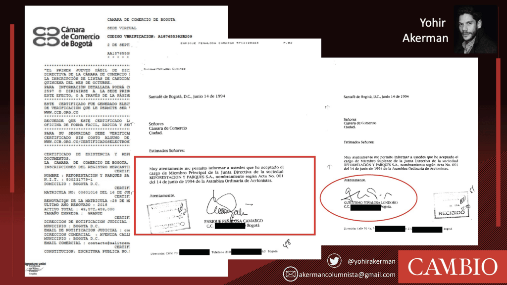 So far, everything appears normal. The issue arises from the fact that, on the date the agreement was signed, the board of directors of Reforestaciones y Parques SA included, among others, Enrique Peñalosa Camargo—the late father of the former mayor with the same name—and his son, Guillermo Peñalosa Londoño. Notably, Londoño later changed his name to Gil Peñalosa upon relocating to Canada.