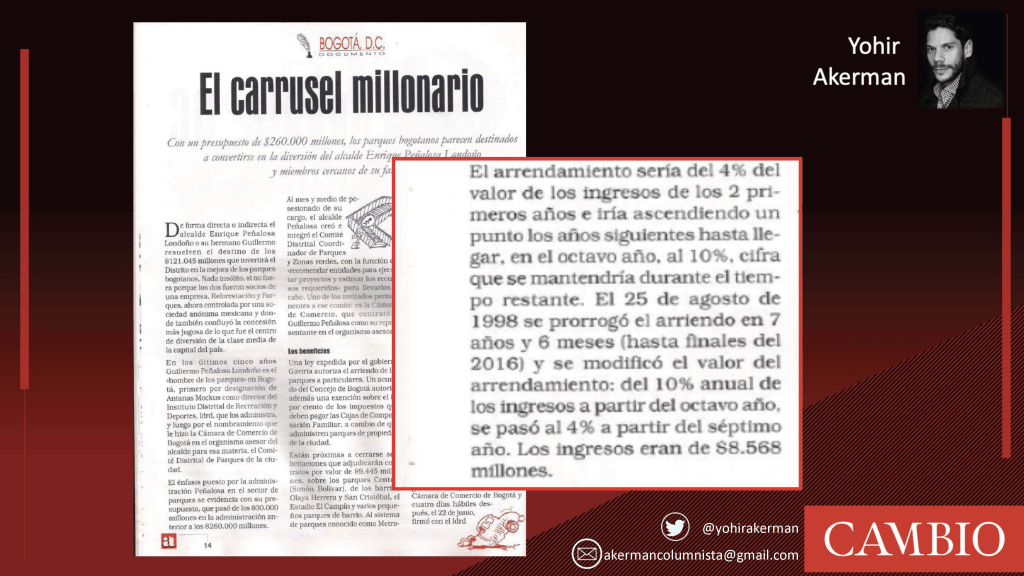 Remarkably, on June 10, 1994, the company Inversiones Lindaraja partnered with three other firms and five individuals to establish Reforestación y Parques SA. A mere 12 days later, they signed the agreement. The Peñalosas’ good fortune is evident: they created a company and quickly secured a lucrative contract, which they themselves awarded. Such are the perks of familiarity with public procurement.